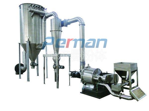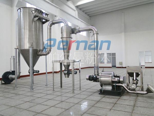 物料由加料系統均勻的送入粉碎室受到高速旋轉的粉碎盤的強烈沖擊,同時受到離心力的作用,與粉碎齒圈發生碰撞,受到剪切、摩擦、碰撞等多種綜合力的作用,使物料粉碎,被粉碎的物料隨氣流運動到分級區,通過變頻調節的分級輪,對粗細物料進行分離,符合細度要求的產品隨氣流進入旋風收集器和除塵器收集,粗物料返回分級區二次粉碎。